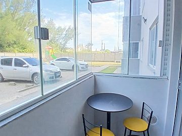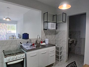 A cozinha americana integrada à sala é ideal para momentos de convívio e facilita o dia a dia. A sacada com churrasqueira proporciona um espaço perfeito para relaxar e apreciar a brisa do mar. O apartamento já vem equipado com fogão e microondas, agregando ainda mais valor à sua experiência.